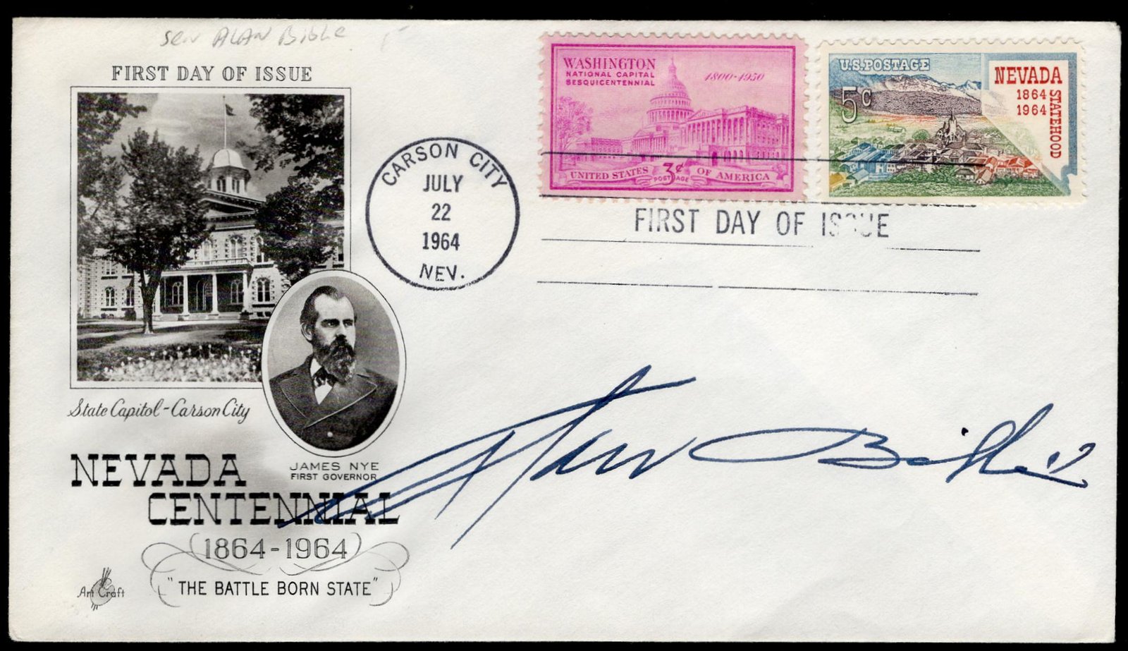 US 1964 #1248 FDC Signed by US Senator Alan Bible of Nevada