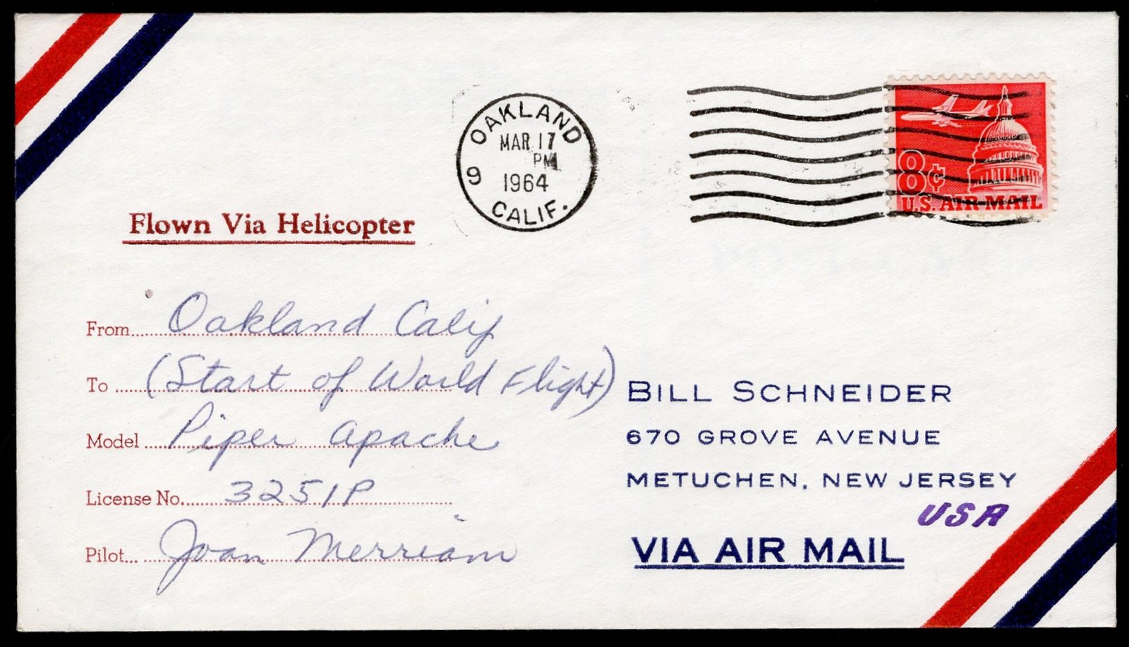 US 1964 (Mar 17) #C64 on Airmail Cover flown via Helicopter & Signed by Pilot Joan Merriam. She was known for solo flight around the world.