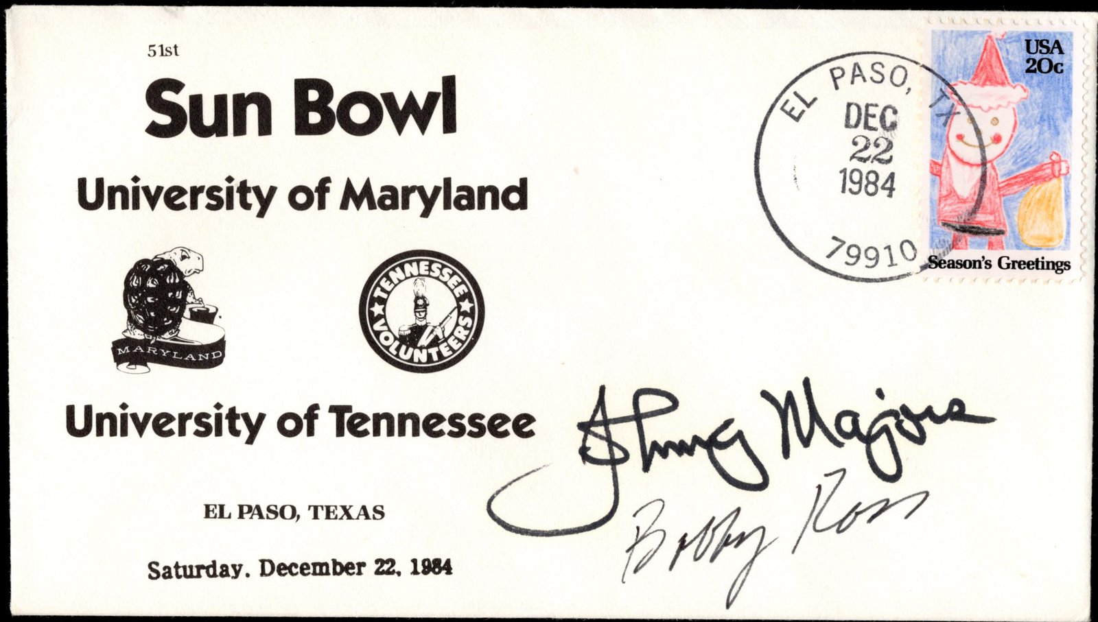 US 2108 Sun Bowl Cover Signed by Bobby Ross & Johnny Majors, Coaches for the 1984 Sun Bowl