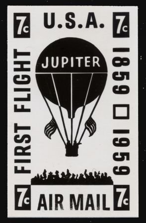 US 1959 C54 Balloon Jupiter Photo Essay, similar to final design but with “First Flight” on left side instead of “Lafayette, Ind.” Stamped “Not Used” on reverse.