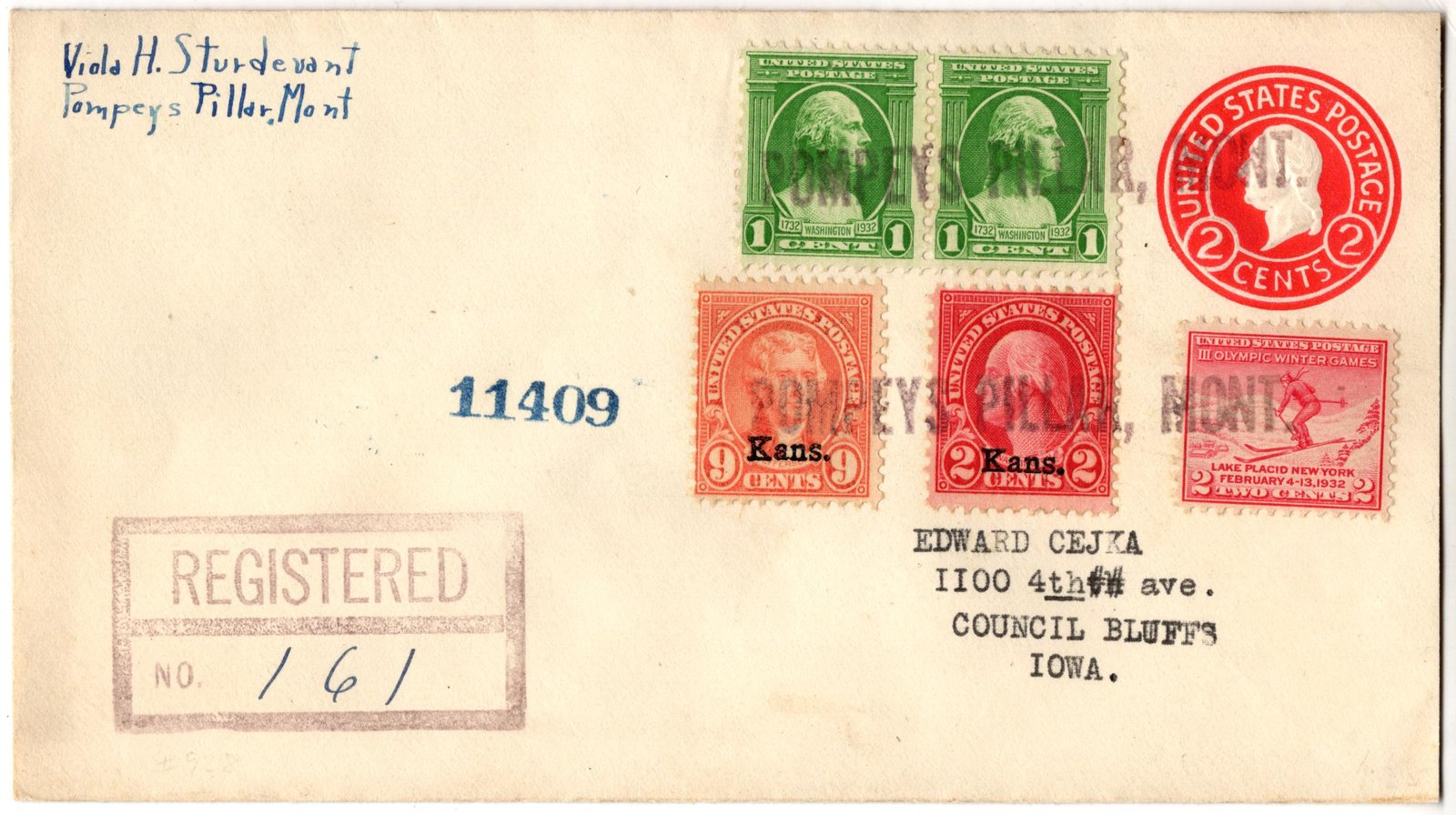US Pompeys Pillar, MT 1932 (Mar 5) Registered cover U429 with 660, 667, 705 and 716 sent to Iowa. Stamps are tied by 2 x fancy cancel #929 “Pompeys Pillar, Mont.” in black.