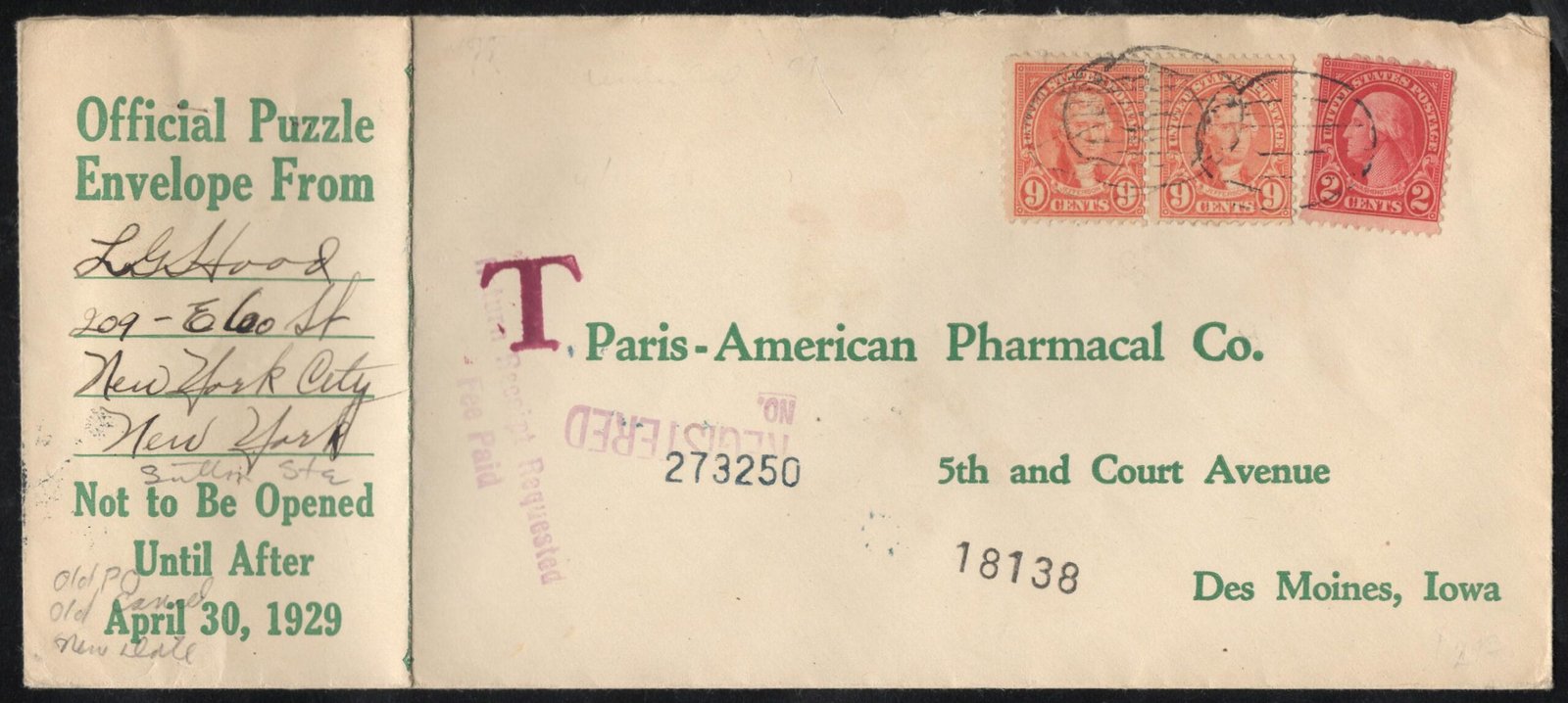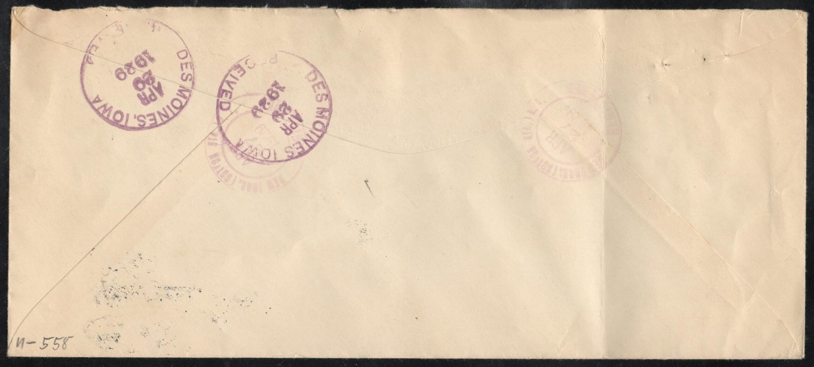US New York, NY 1929 (Apr 29) Registered legal sized commercial cover with 634 and 641 (x2). Stamps tied by three strikes of N-558 fancy cancel, Oval with Parallel lines, in black. Vertical crease where it had been neatly creased.