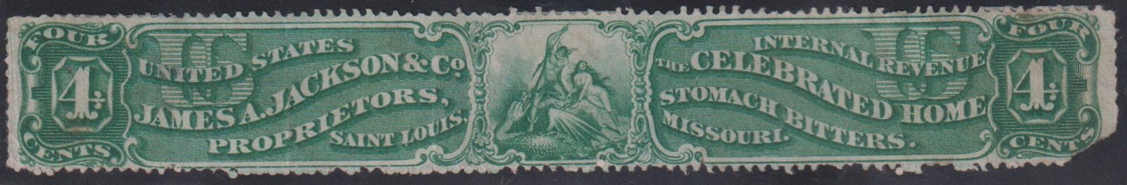US Revenues #RS143a Used F Jampes A Jackson & Co. 4c Green, Old paper Missing LR corner Cat Value: $2250