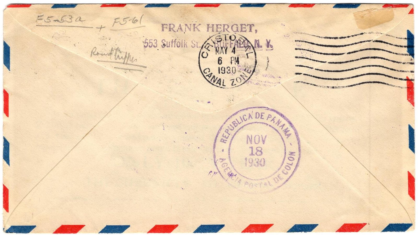 US/Venezuela 1930 First Flight Miami – Venezuela via Canal Zone onĀ VF US airmail cover with US and Venezuela stamps. Backstamps including Panama. Auction sale $340