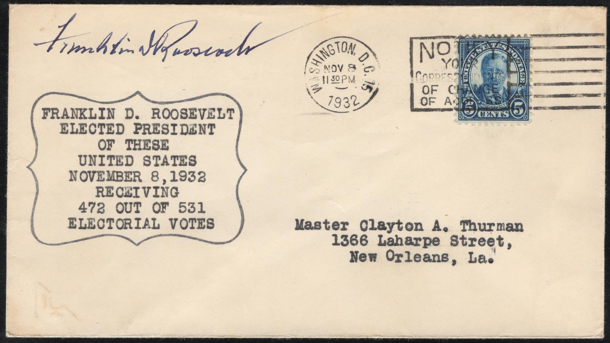 1932 U.S. (Nov 8) #637 , 5c Teddy Roosevelt stamp, on Election Day Cover Signed by Franklin Roosevelt.