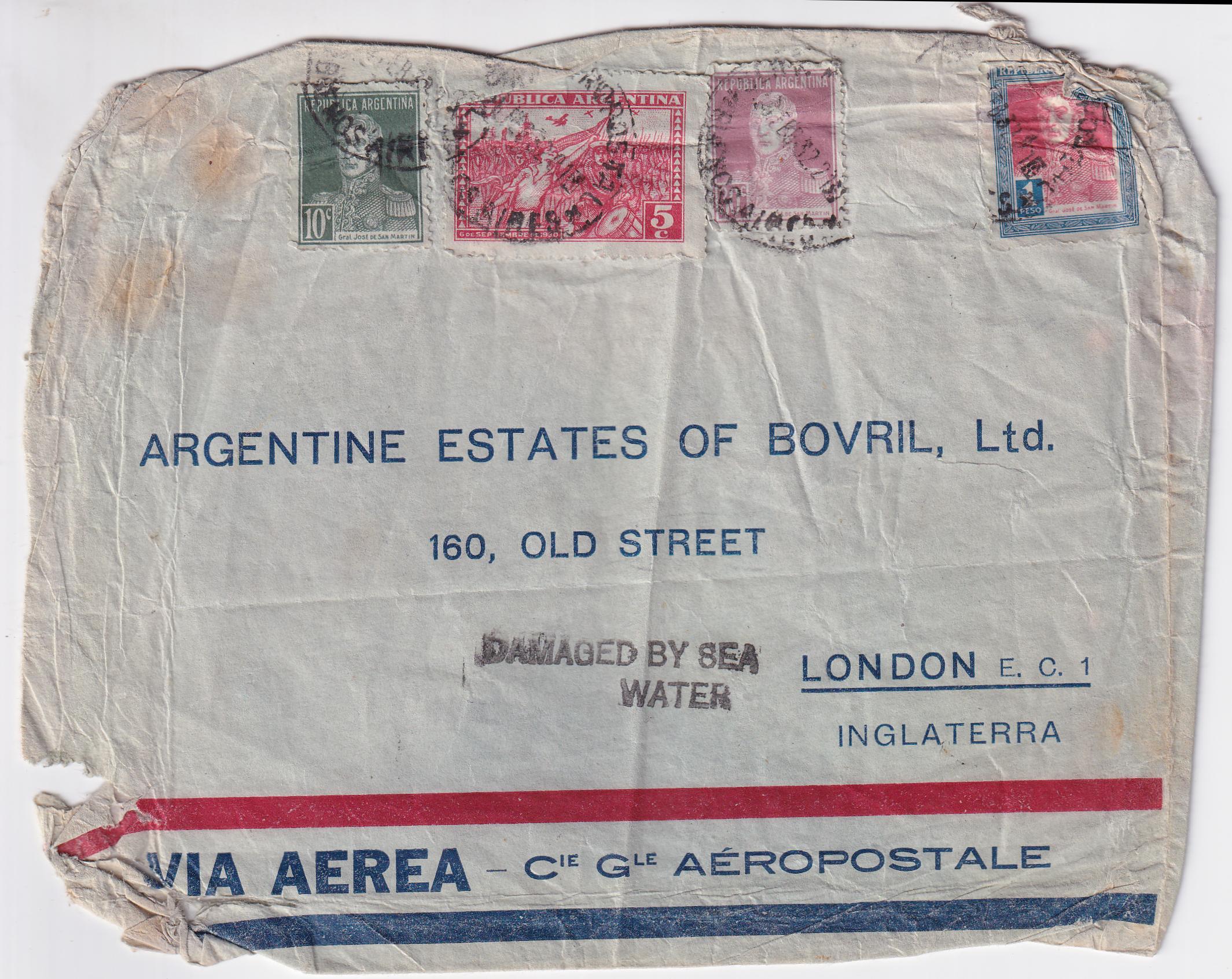 Argentina 1932 (Feb 27) Airmail Cover from Crash in Brazil. Caught in a storm in Brazil, the plane was struck by lightening. Crash mail was found in the sea and stamped "Damaged by sea water". 3L. D2 27e Sfr.300.