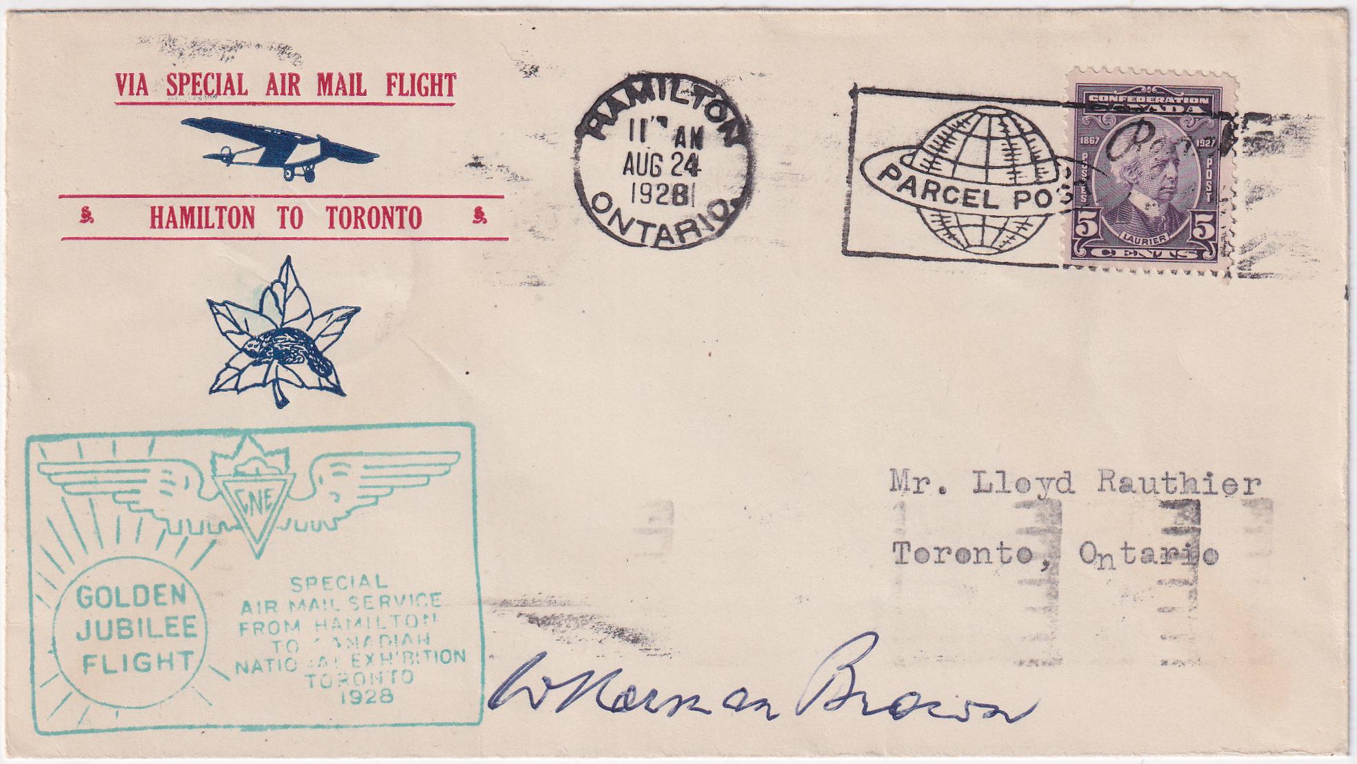 Canada 1928(Aug 24) Golden Jubilee Flight Hamilton - Toronto, Signed by Pilot W. Norman Brown