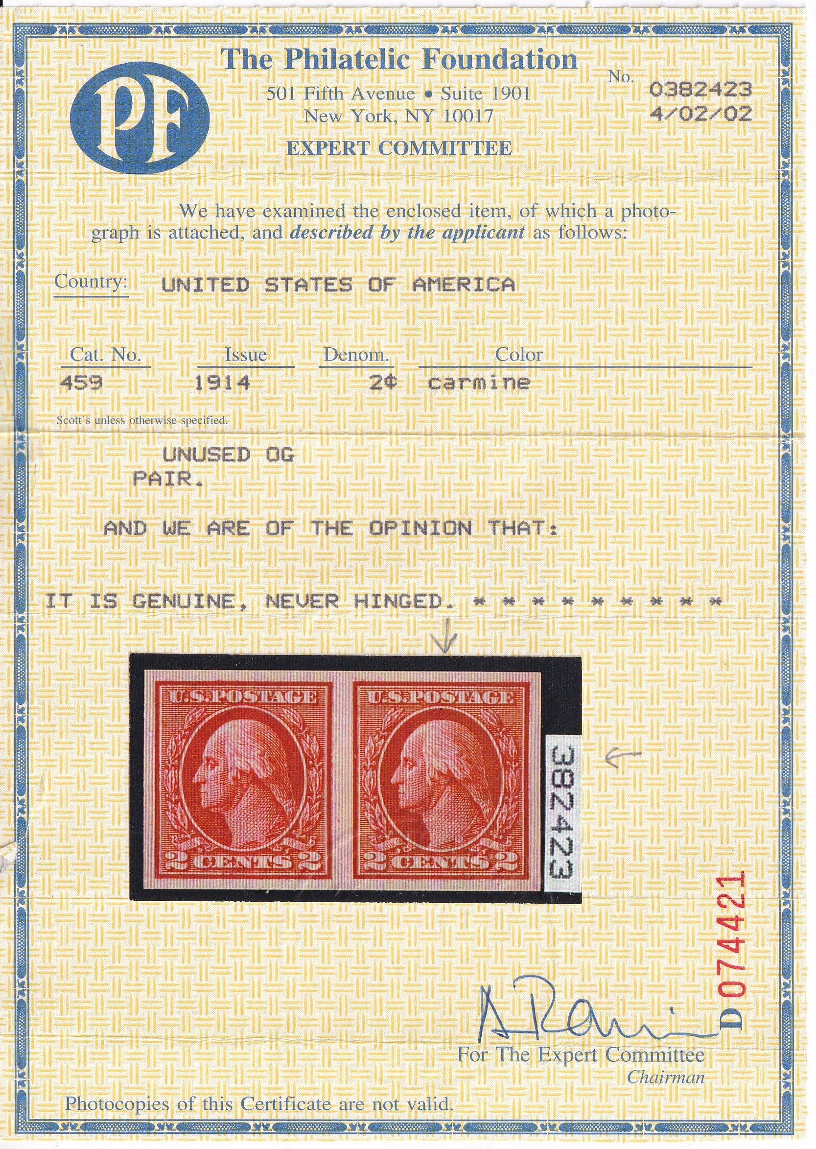 US Washington - Franklin #459 NH Mint XF - SUP PFC for pair, tiny gum skip not noted on cert Cat Value: $500 as 95