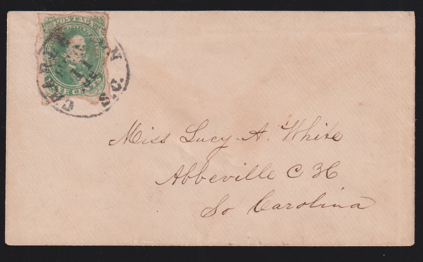 US Confederates #1 CSA 1 4 irregular margins neatly cancelled charlston SC very faint horiz crease from letter inside post 21 spur upper left feb 112 1862 to Abbeville sc top backflip replaced beautiful use of irregular margins Cat Value: $400