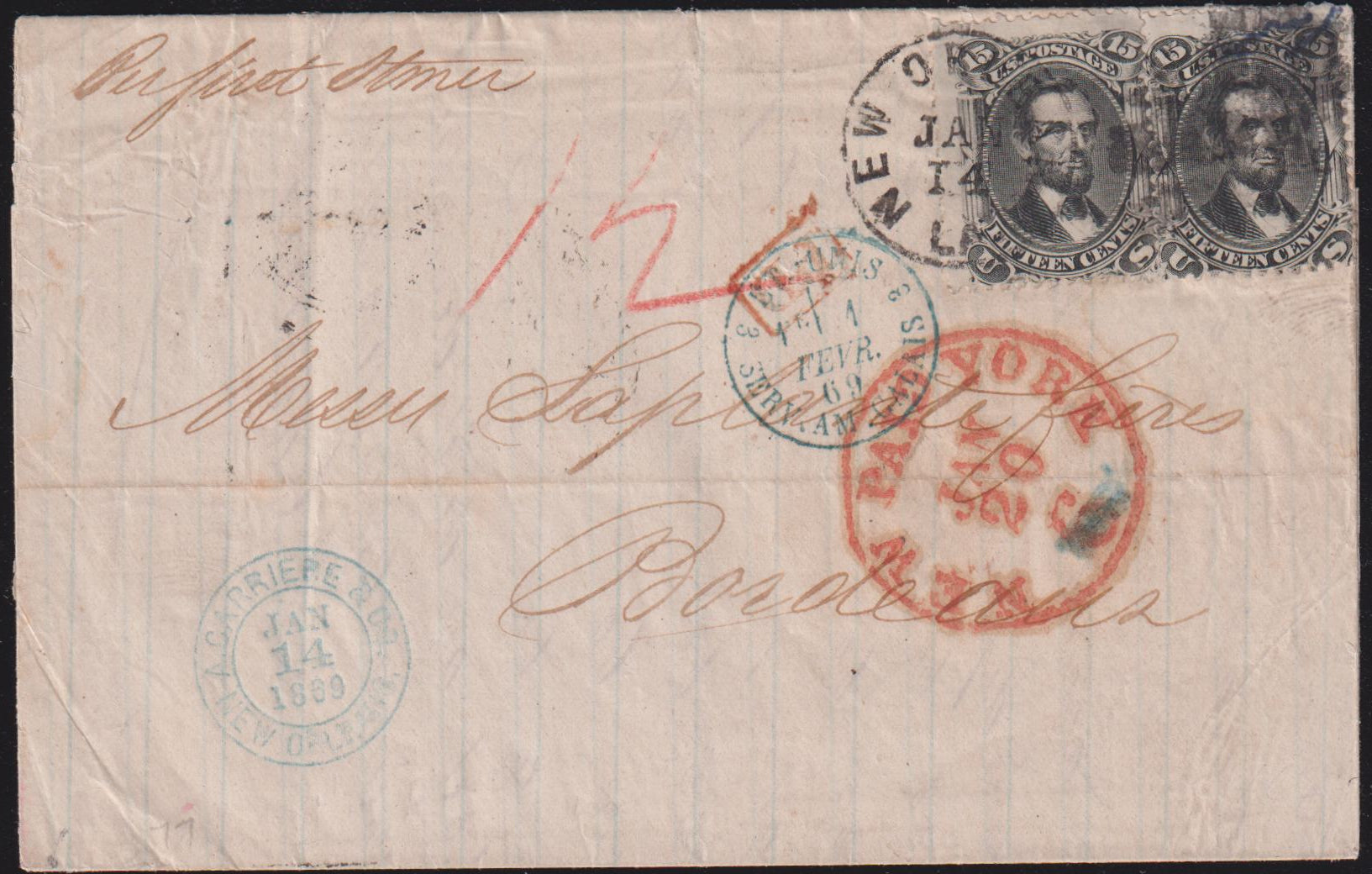 US Classics #77x2 F-VF folded letter New Orleans to Bordeux stamps Ave-F Cat Value: $400
