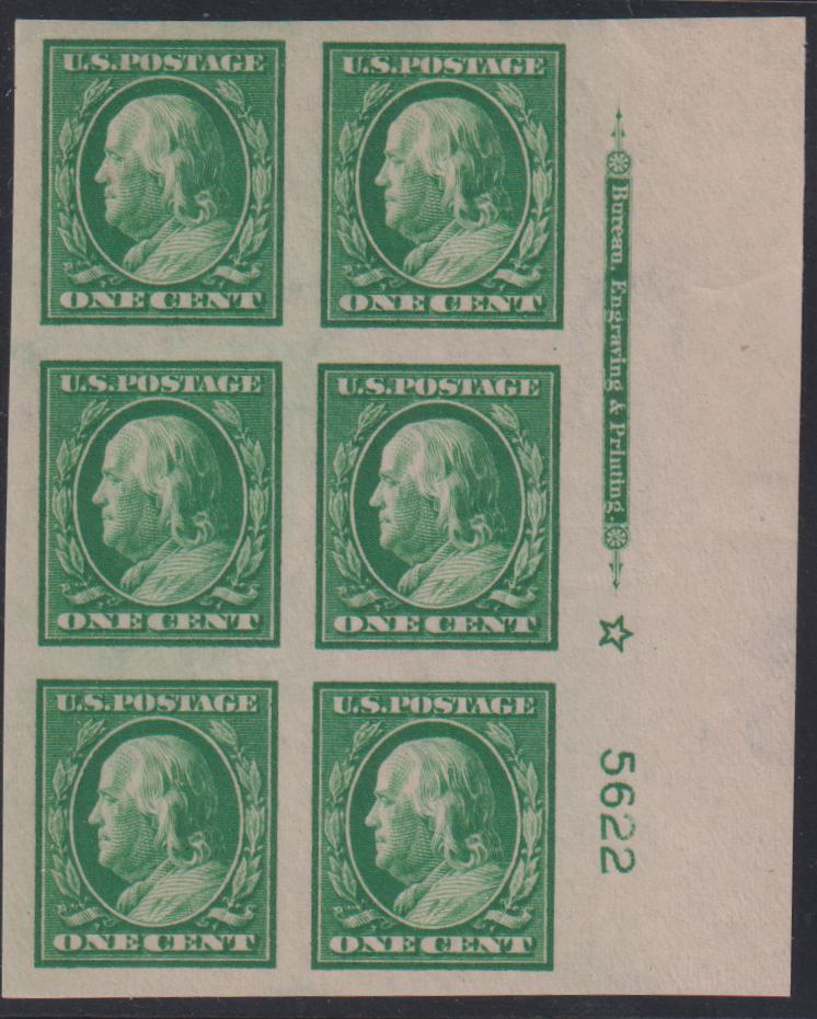 US Washington - Franklin #383 NH Mint XF right number block of 6 quarter inch crease Cat...