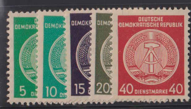 German Democratic Republic #MiO18//25 NH/LH VF Note in scott after O27 1SpfLh Mi 29-33. All Zeichnnung 4 (botton open) 29-33 fibers in paper YIIXII Cat Value: Michel €6990 Scott: $1800