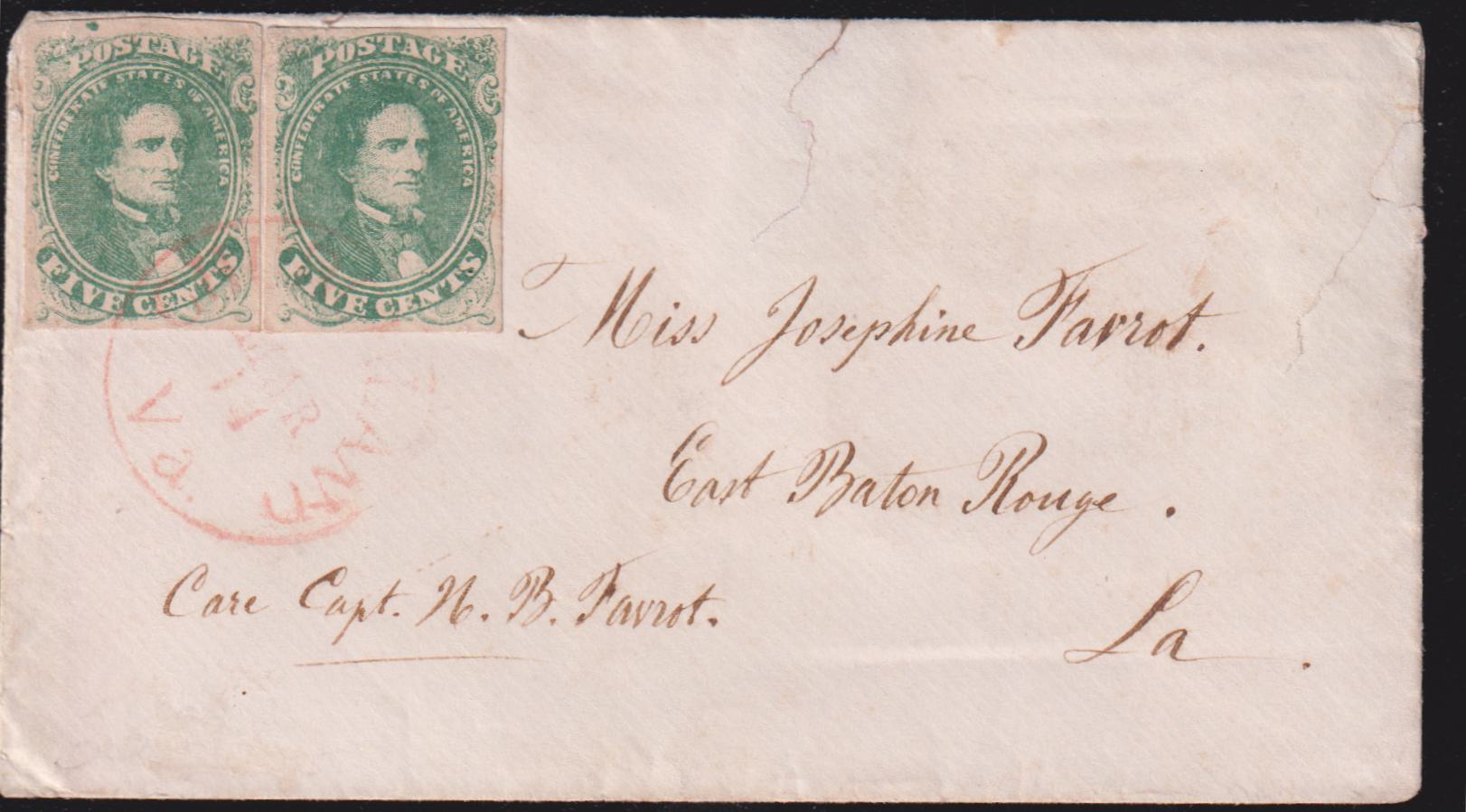 US Confederates #CSA 1 2 VF Stamps on F-VF cover repoised tears to rtighjt of stamps VA cds to Miss Josephine Forest, Cxo Capt NP Foveot east beton rouge LA Cat Value: $450
