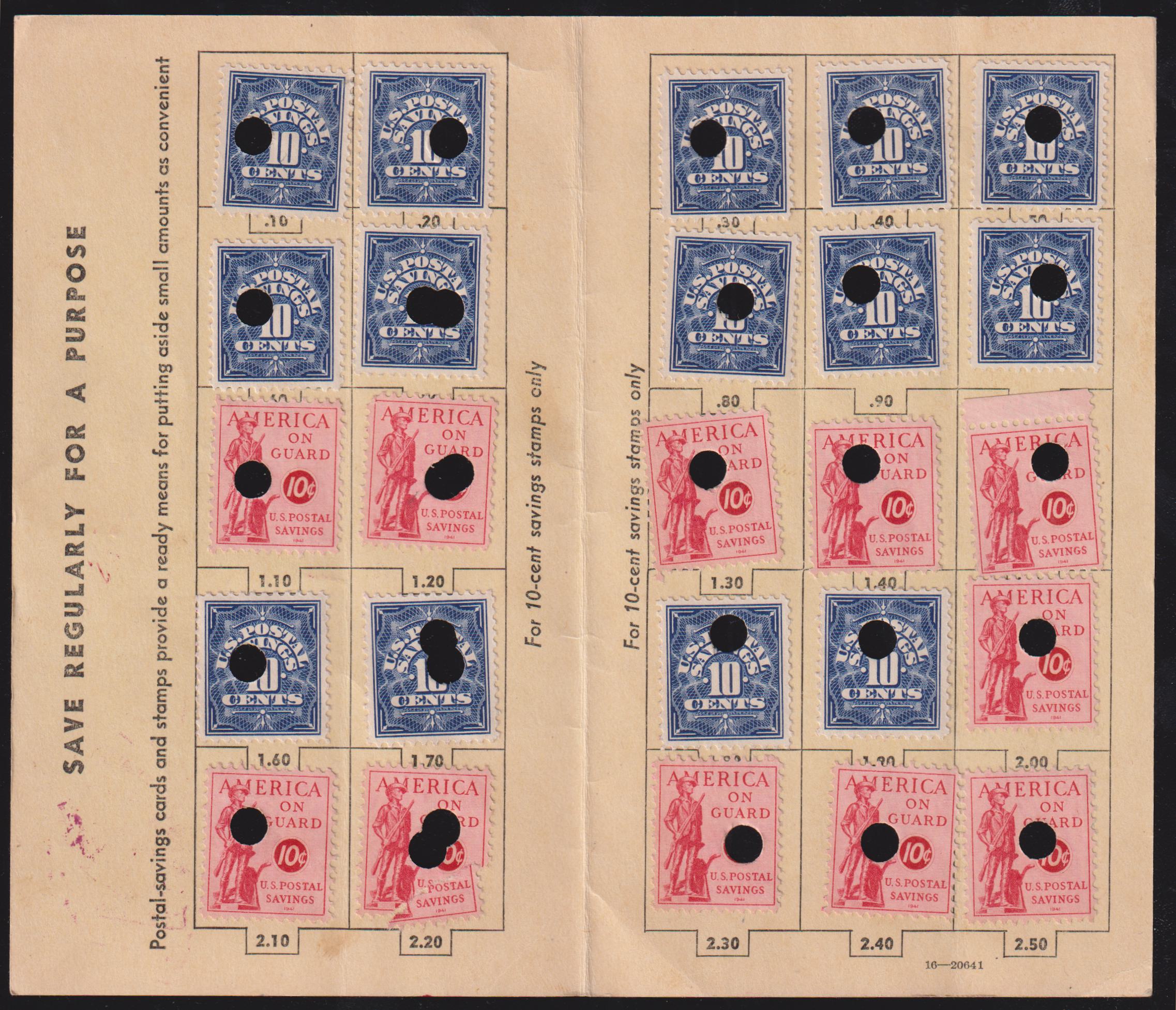 US Savings Stamps #PS6 x14 PS11x11 on March 1941 form 333 redeemed by hole punches unusual