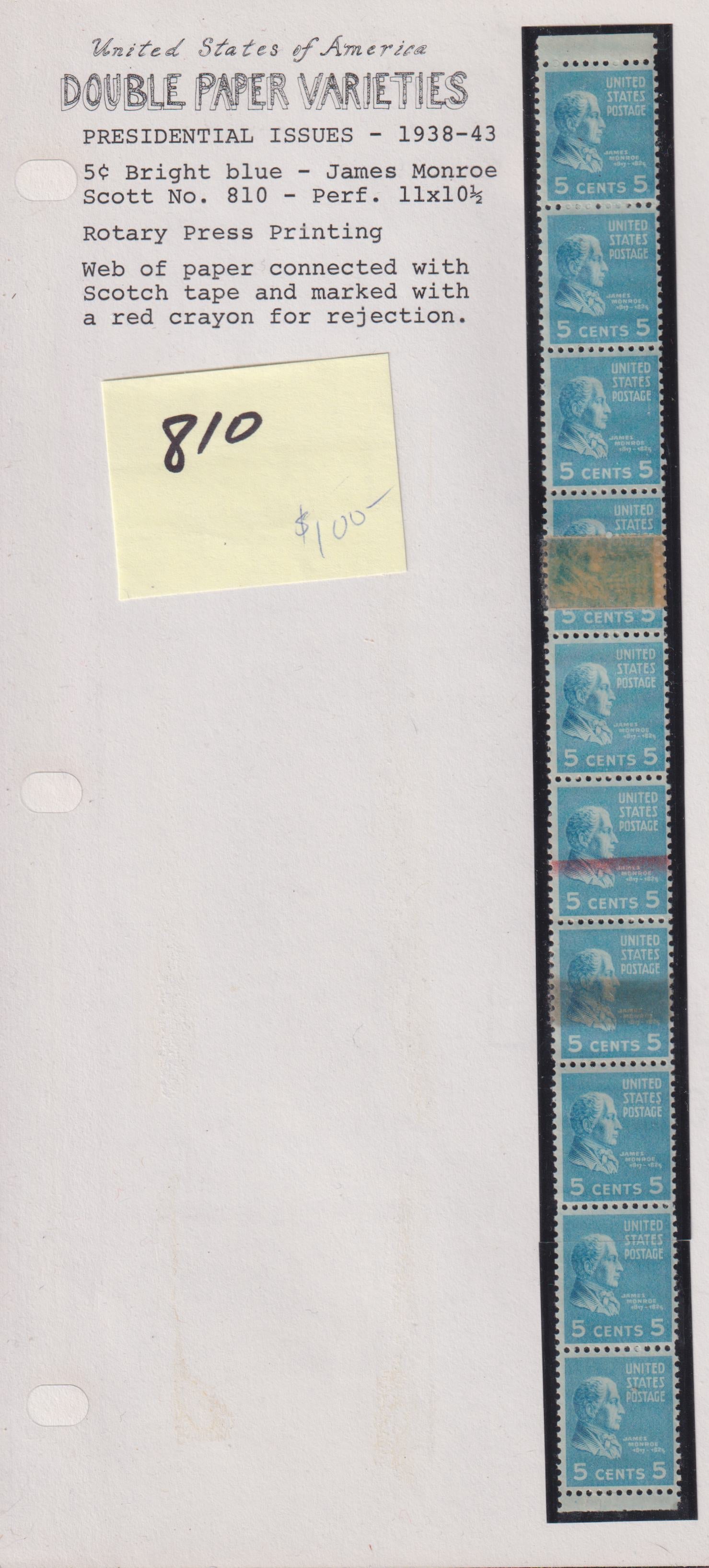 US Modern #810 VF Double paper strip of 10 with red rehection mark