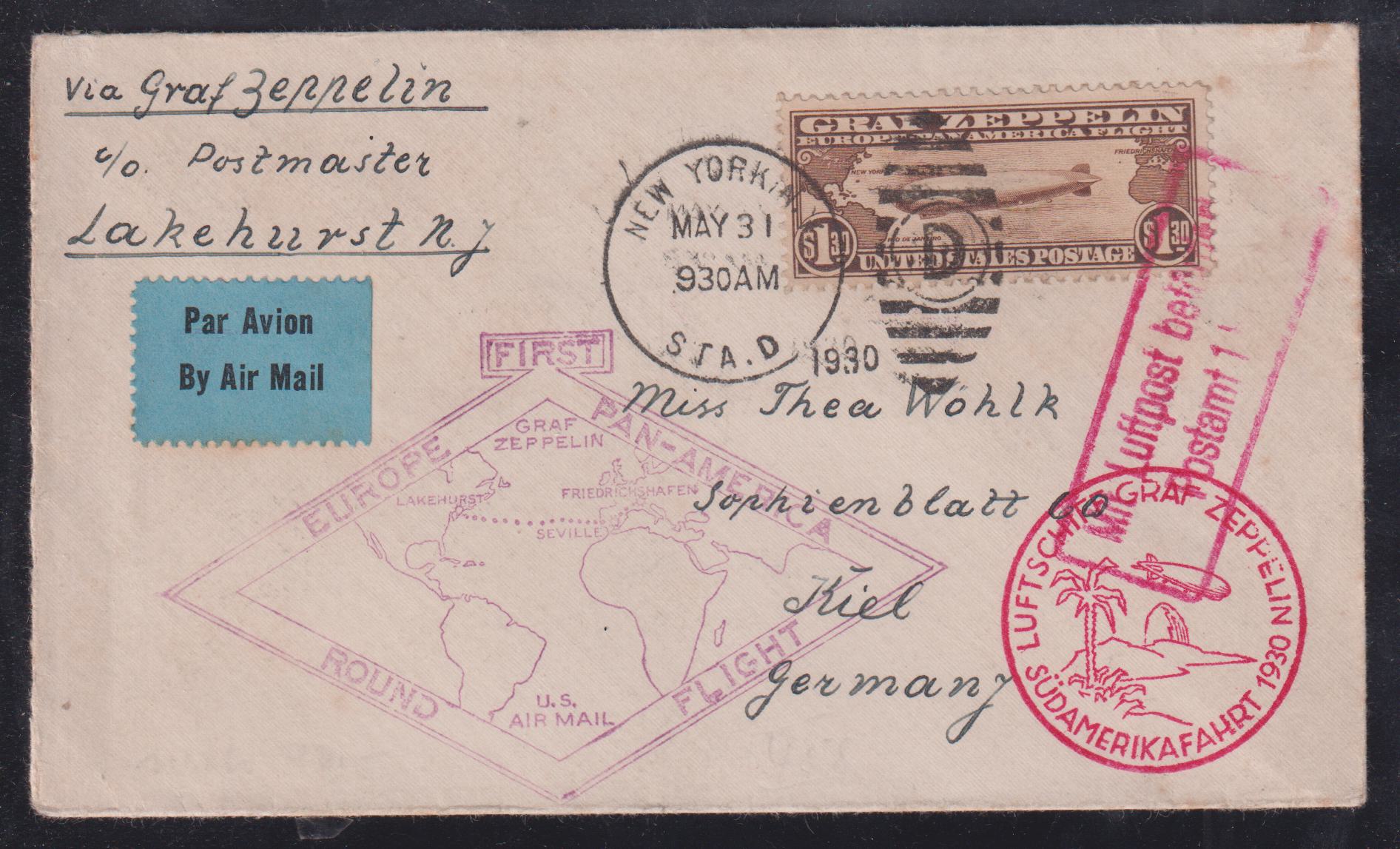 US Airmails 1930 #C14 VF Flight Cover NY to Kiel Unusual cachets and backstamps and Kiel airmail...