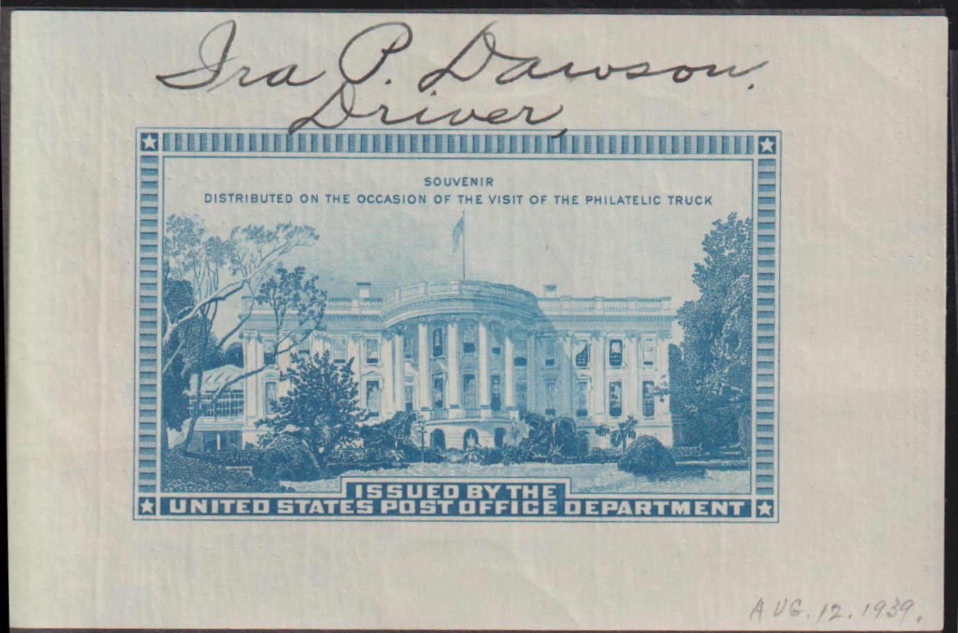 Autographs Philatelic #Philatelic Truck SS LH Mint VF Gummed signed by Driver Ira Dawson Dated in pencil Aug 12, 1939