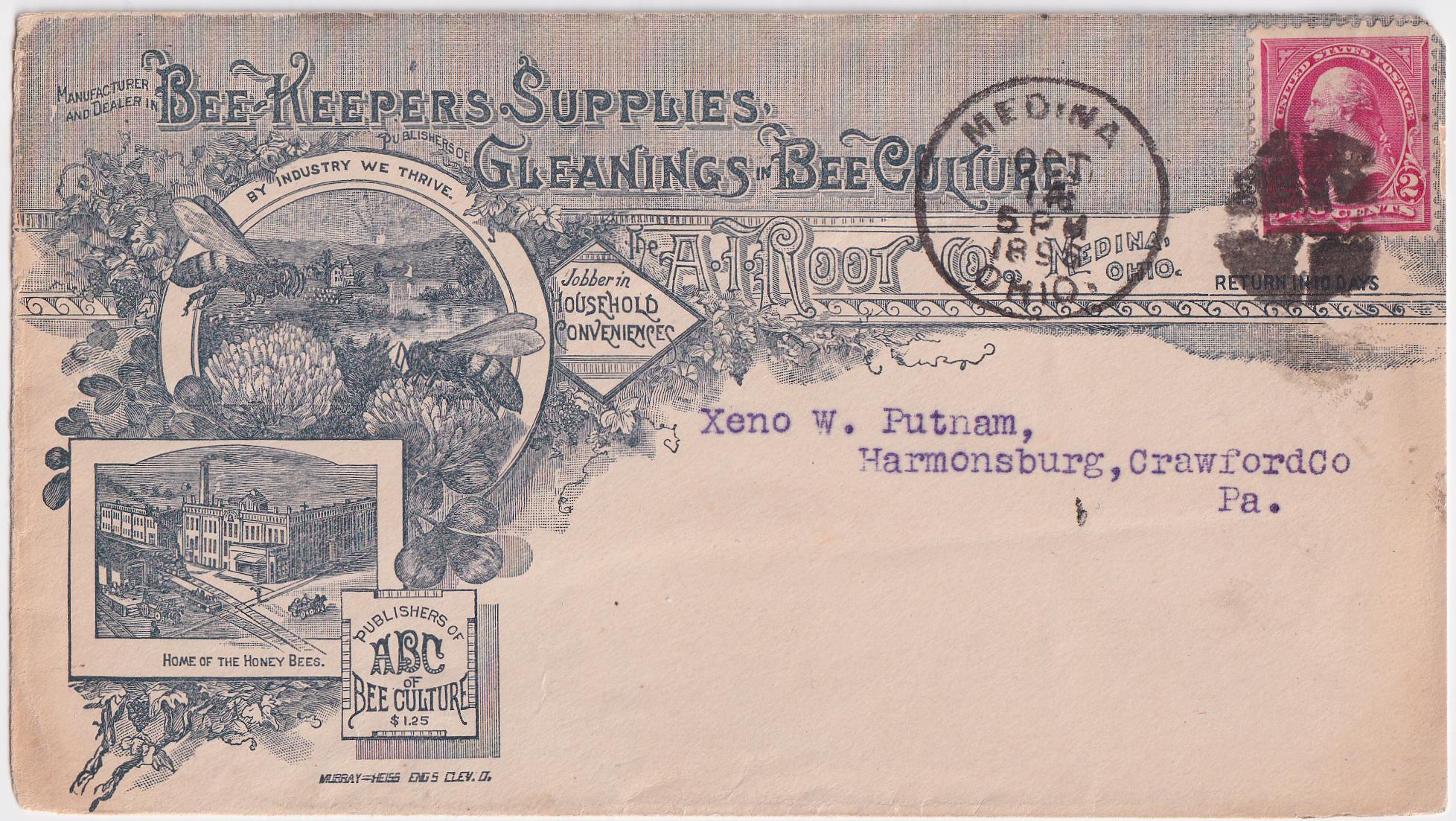 US 1 1899 Bees Advertising cover " Keepers Supplies, Gleanings in Bee Culture" with intricate rendering covering most of envelope. Large bees in foreground. Very attractive cover!
