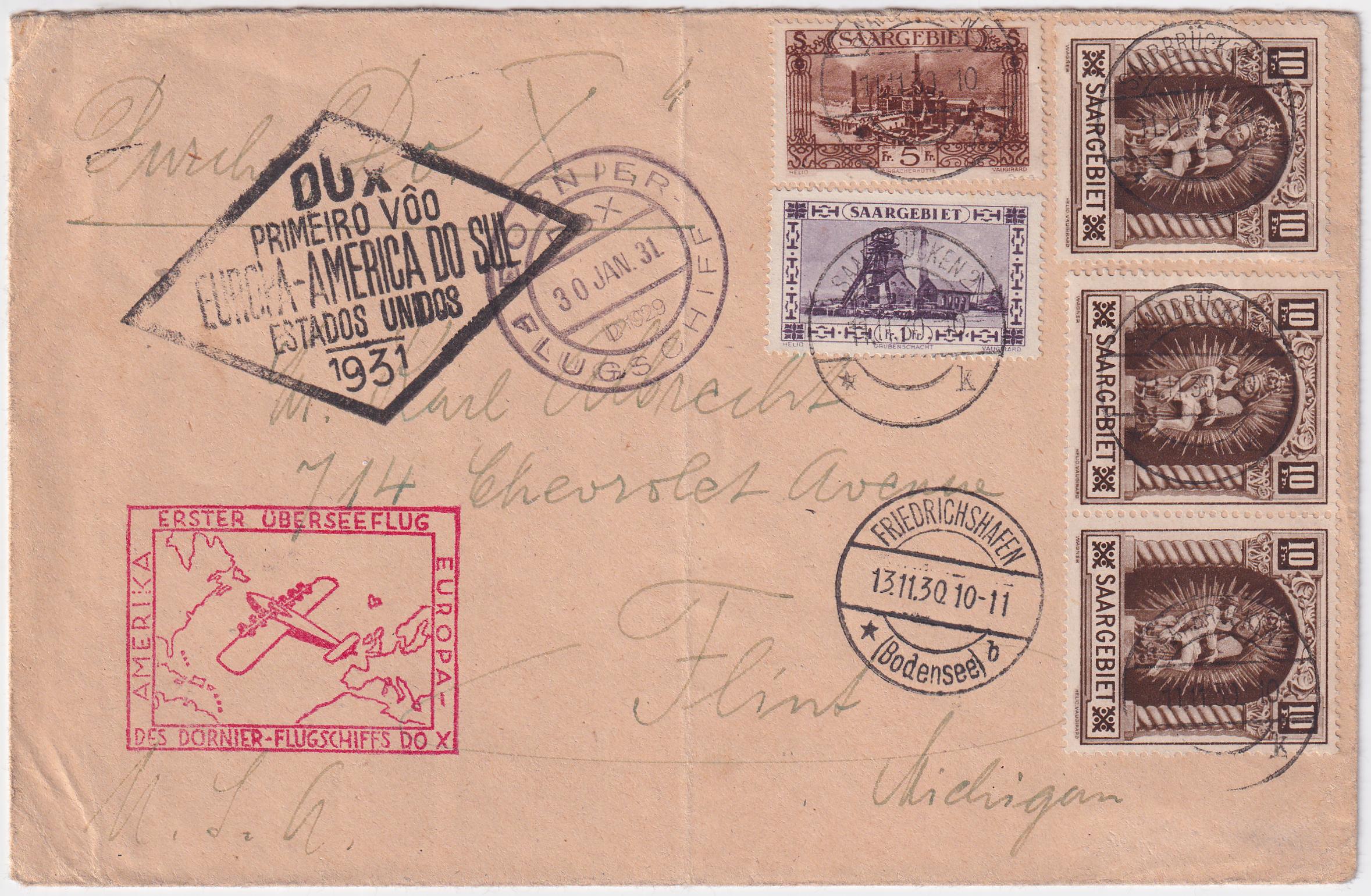 Saar 1931 Do-X Flight Lisbon to Canary Islands. Friedrichshafen 13.11.30postmark, Flugschiff 30 Jan 31 postmark. Rare 22.IV.31...