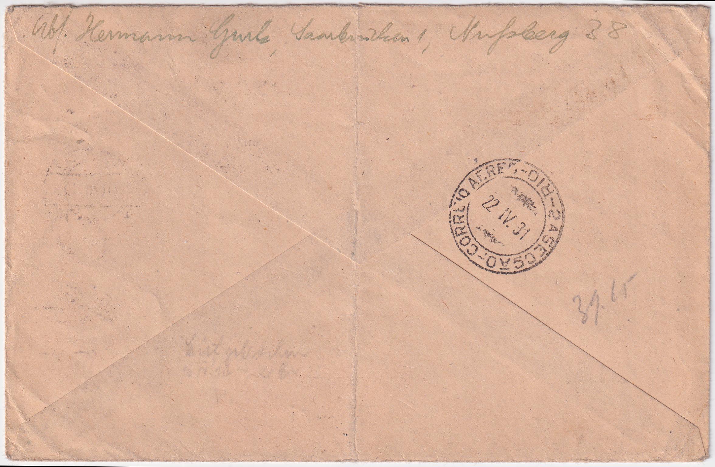 Saar 1931 Do-X Flight Lisbon to Canary Islands. Friedrichshafen 13.11.30postmark, Flugschiff 30 Jan 31 postmark. Rare 22.IV.31 backstamp indicating the mail was on board the Do-X. Frost 5 D Rio I. cv $950. Vertical crease down the center otherwise VF.
