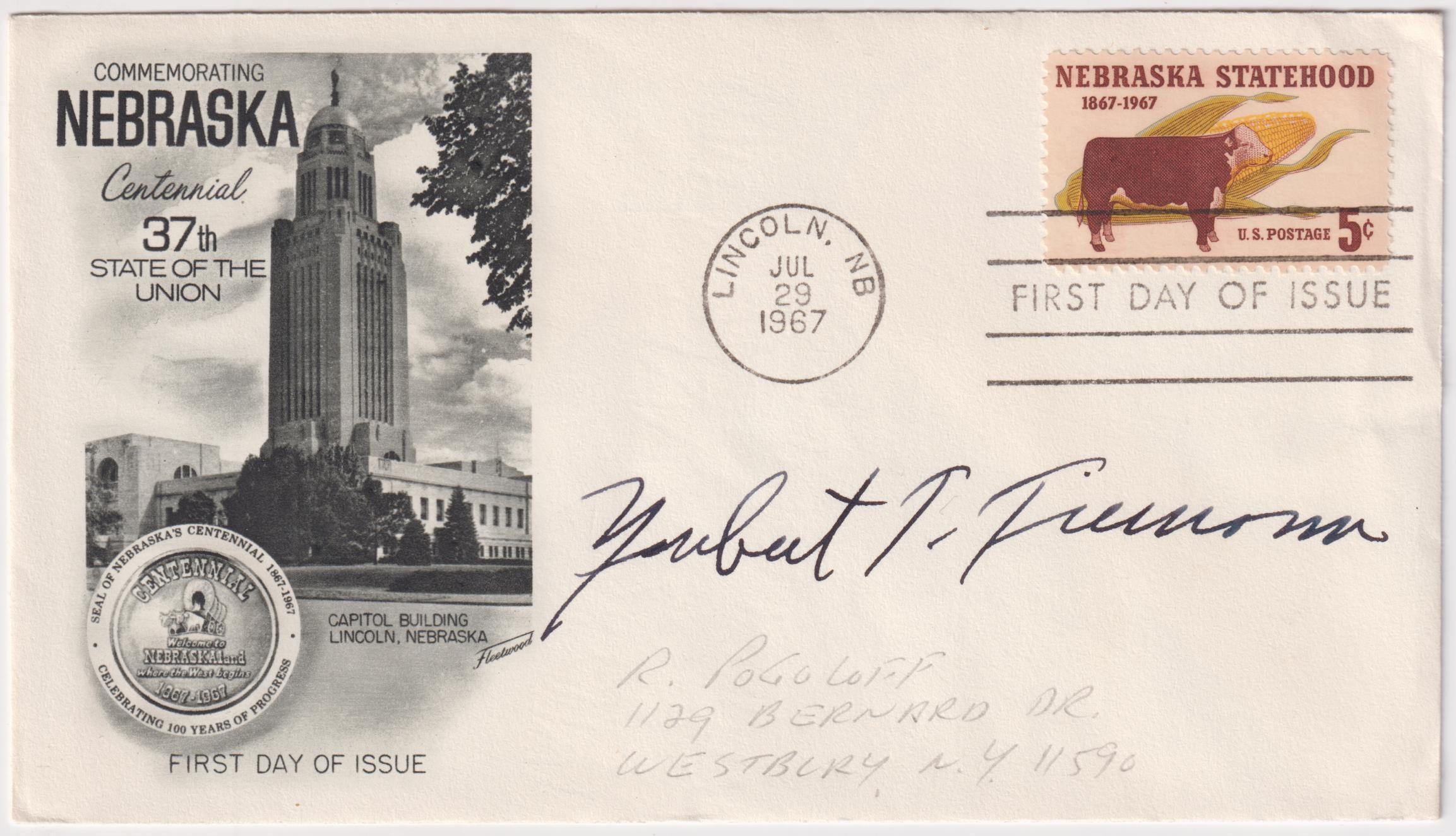 US 1328 FDC Signed by Governor Norbert Tiemann of NE 1967-1971