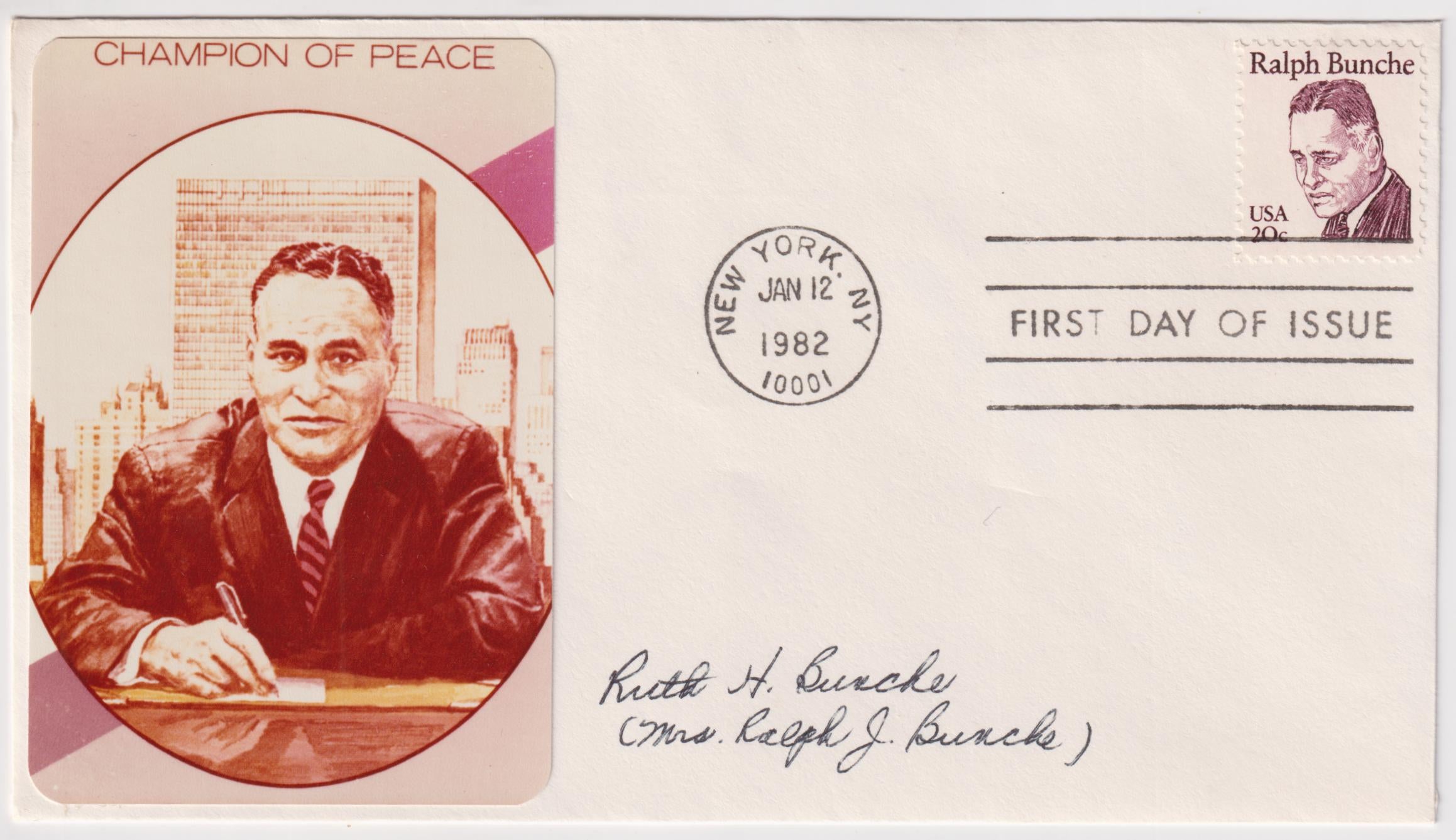 US 1982 (Jan 12) 1860 FDC Signed by Ruth H. Bunche, wife of Ralph Bunche