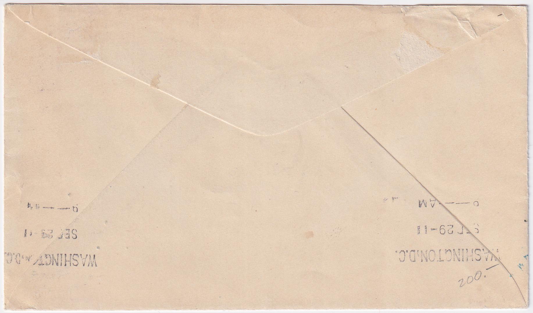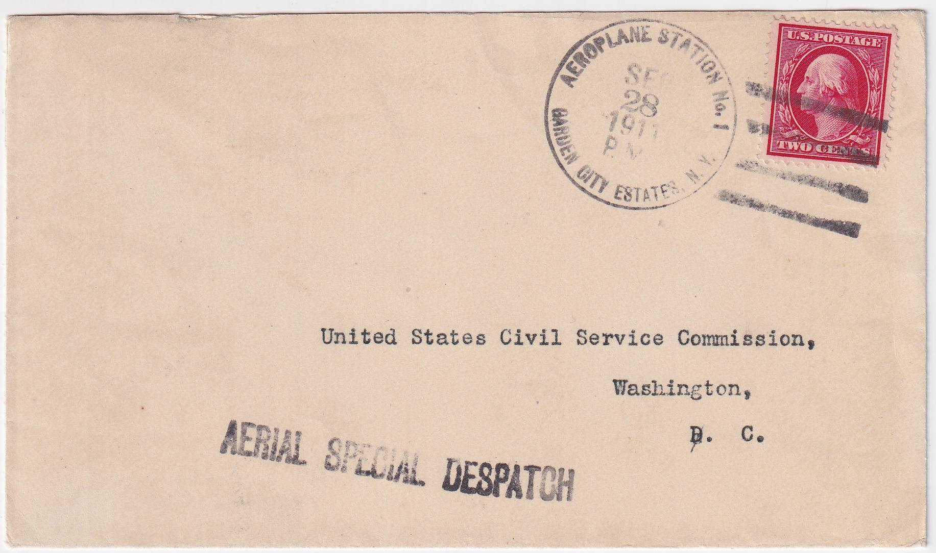 US 1911 (Sep 28) AAMS #3A Pioneer Airmail Cover from Garden City NY. XF cover flown during the International Aviation tournament in NY and addressed to UD Civil Service Commission in Washington DC.