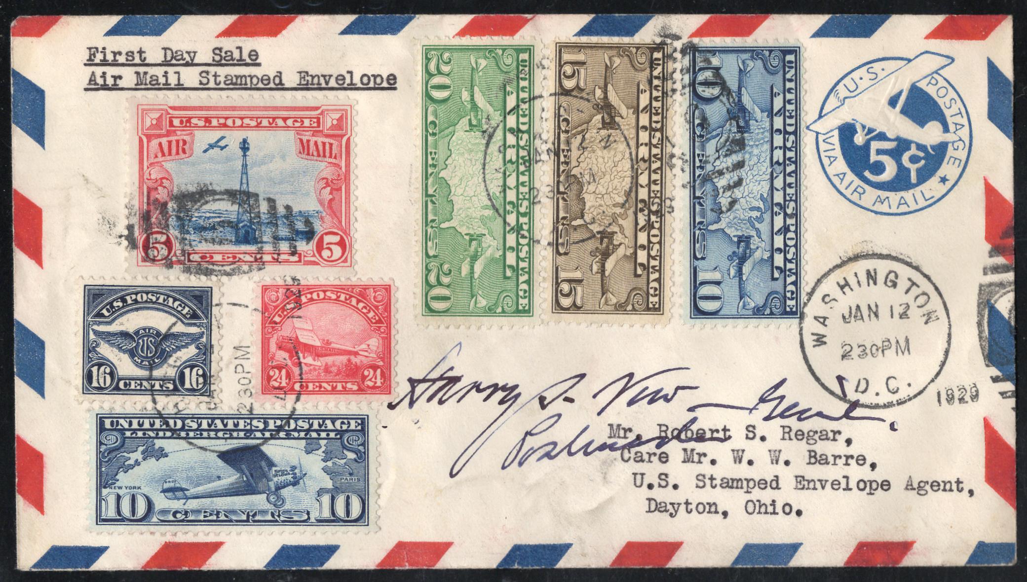US 1929 (Jan 12) C5-C11 on UC1 First Day Cover Signed by Harry S. New, PMG. Sent to Robert Regar, U.S. stamped envelope agent. Historic cover, backstamped Dayton, OH Jan 14.