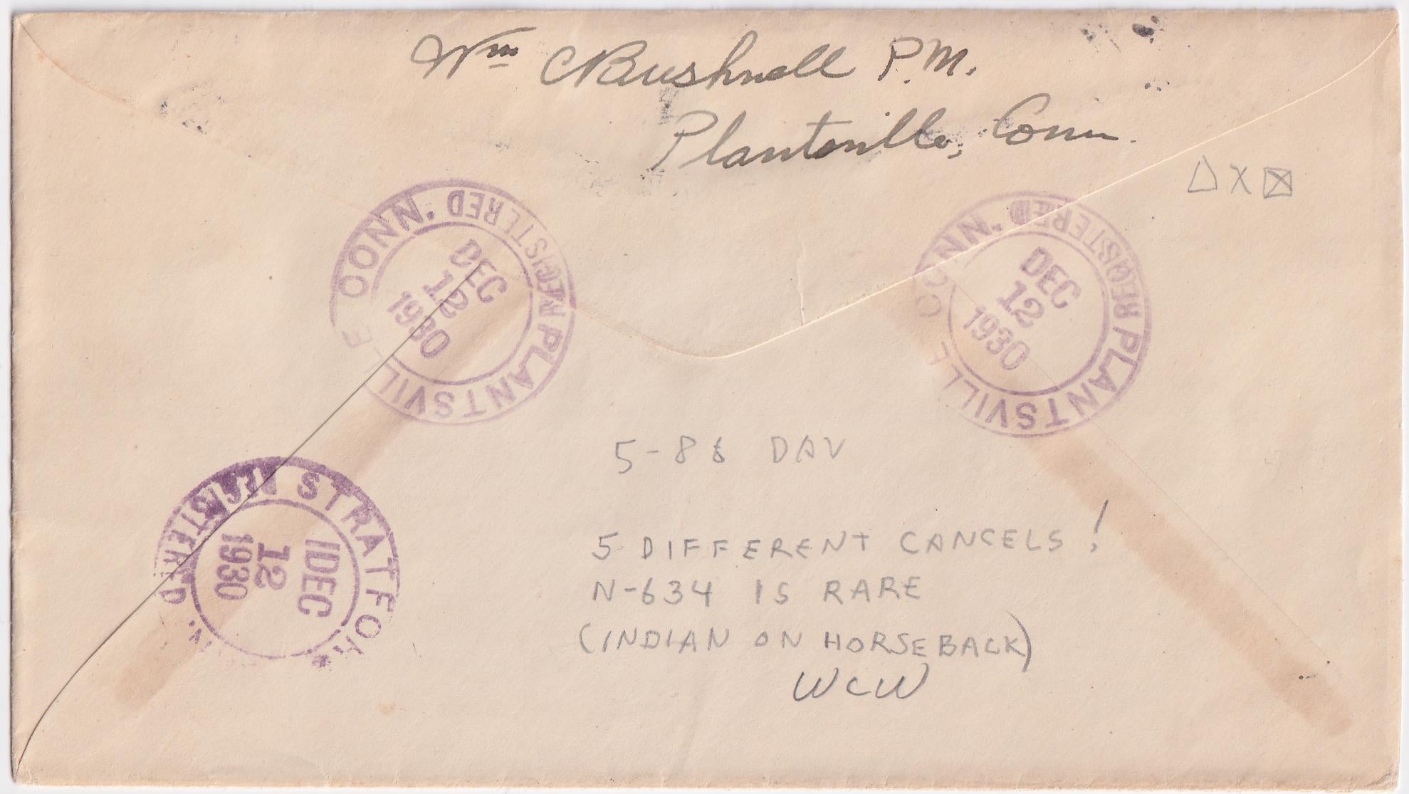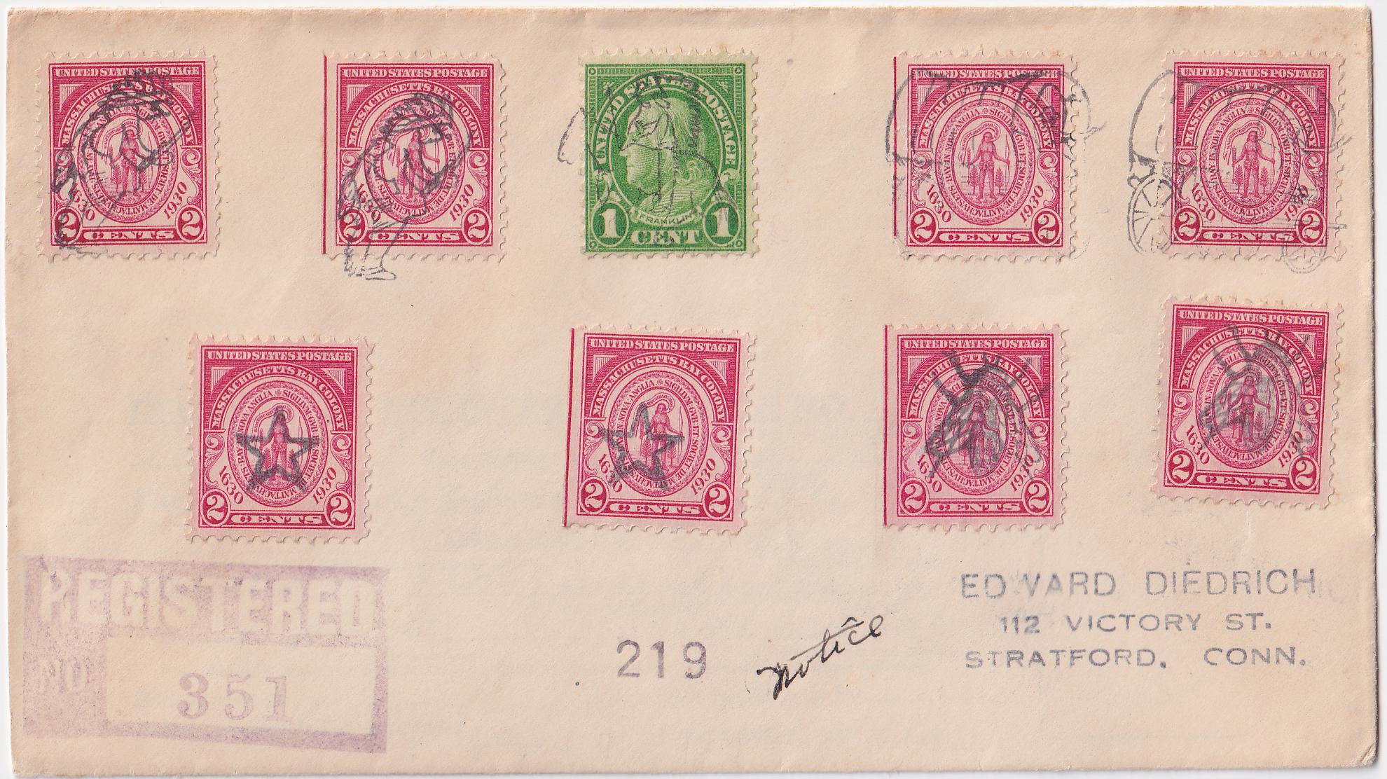 US Plantsville, Connecticut 1930 VF Registered cover from Plantsville CT to Stratford, CT with 9 fancy cancels in black! All very clear strikes.