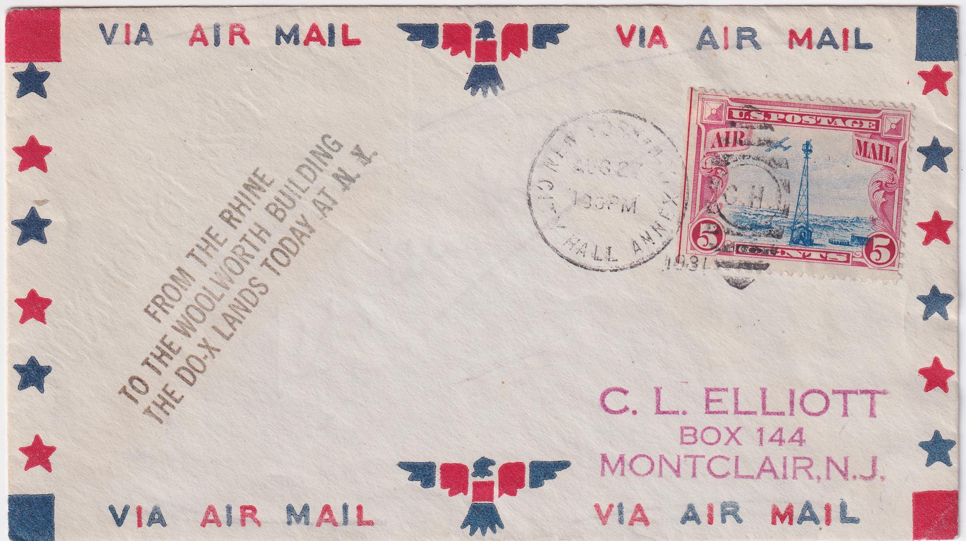 US 1931 (Aug 27) Do-X Airmail Cover with C11, stamped " From The Rhine to The Woolworth Building, The D0-X Lands Today at N.Y". Address to Montclair, NJ.