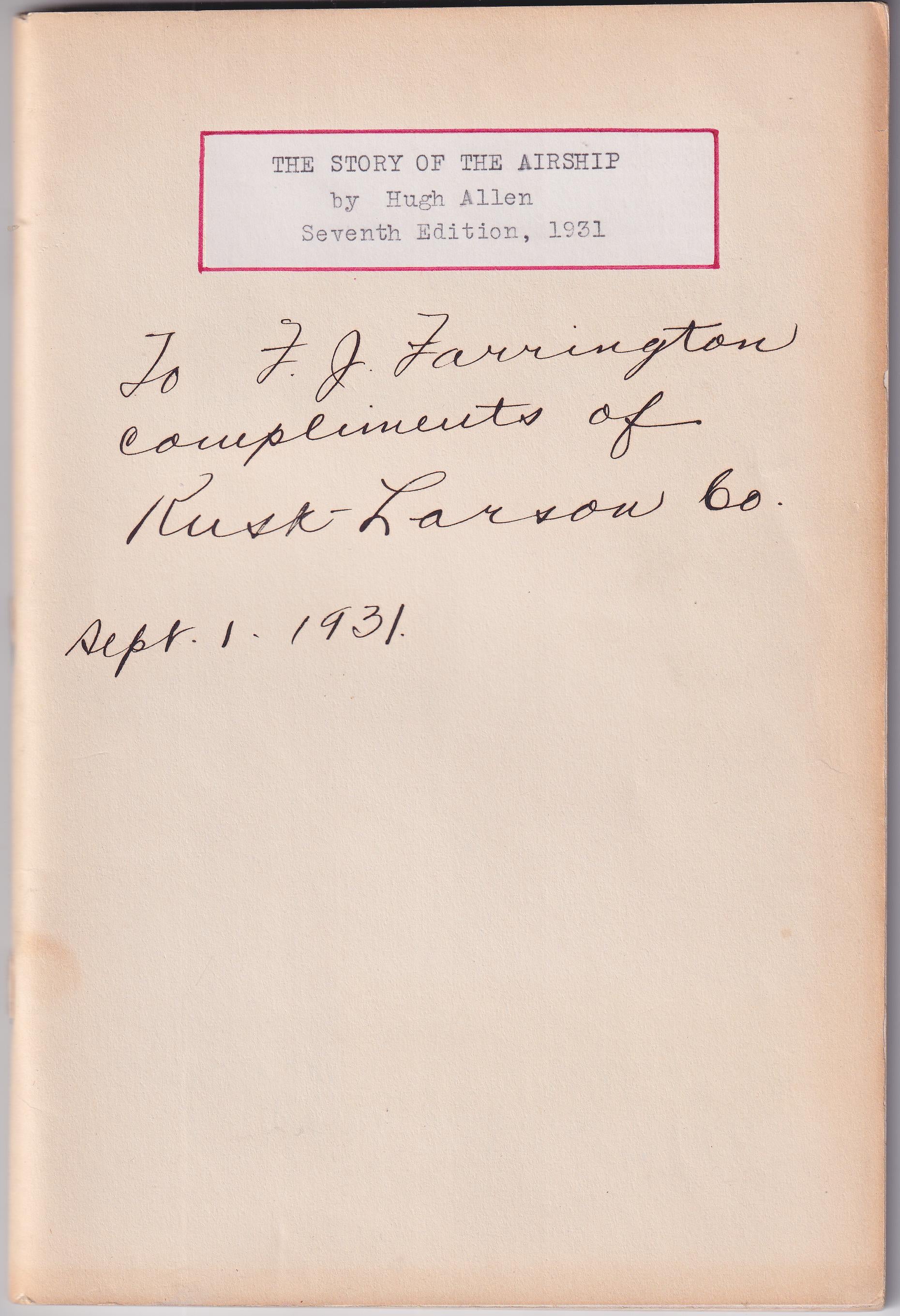 US 1931 "The Story of the Airship" 7th Edition by Hugh Allen, with inscription on cover. 84 page book with photos.