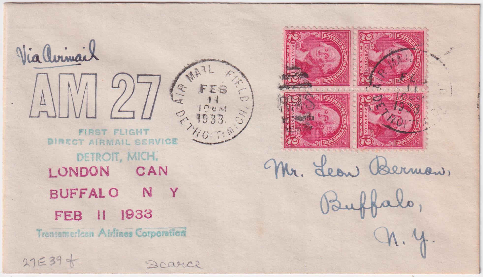 US 1933 (Feb 11) First Flight Detroit, MI to Buffalo, NY. 27E39f
