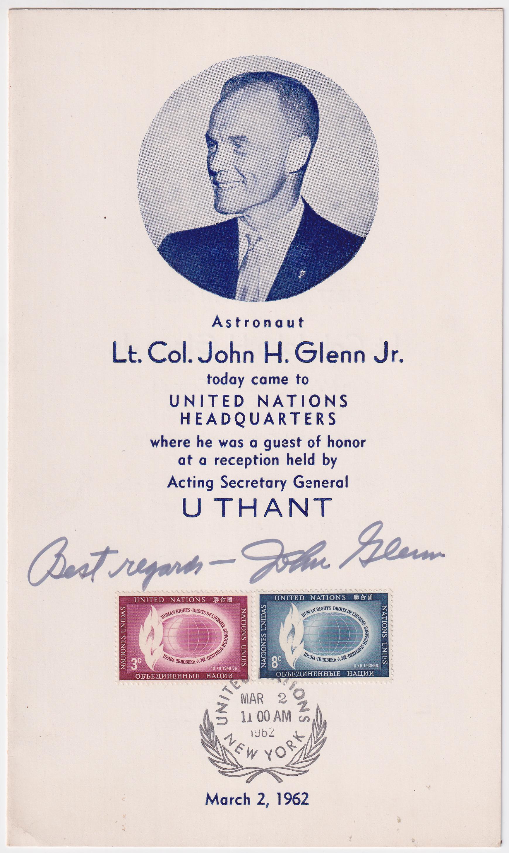 US 1962 Commemorative Leaflet as guest of honor at reception held by Acting Secretary General Uthant. Franked with UN 47-48 and pm Mar 2 1962, New York and signed by John Glenn, aviator, astronaut, businessman, and politician.