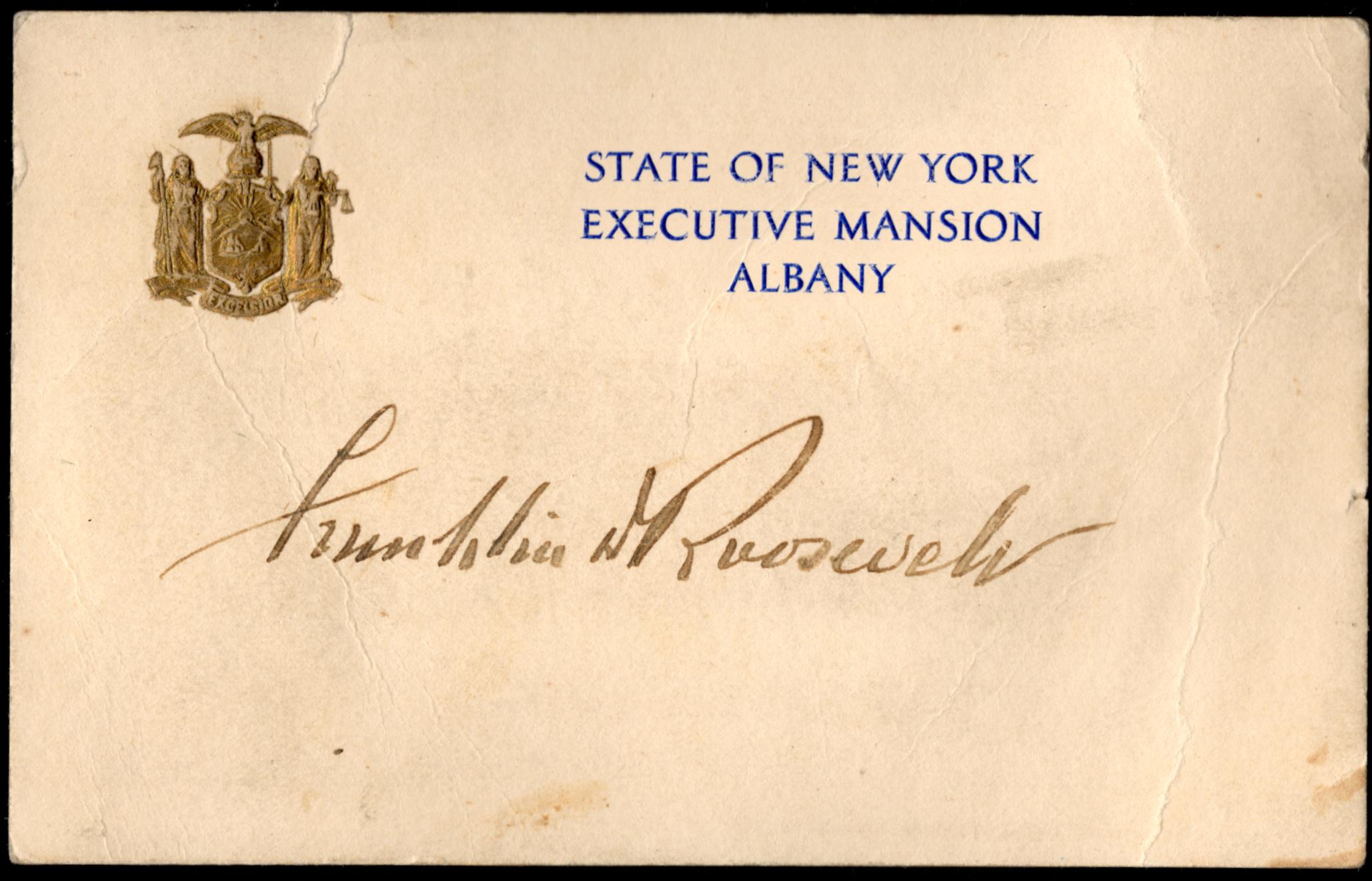 US Autograph - Franklin D. Roosevelt as Governor of NY. Signature on Executive Mansion Card. Some wrinkling...