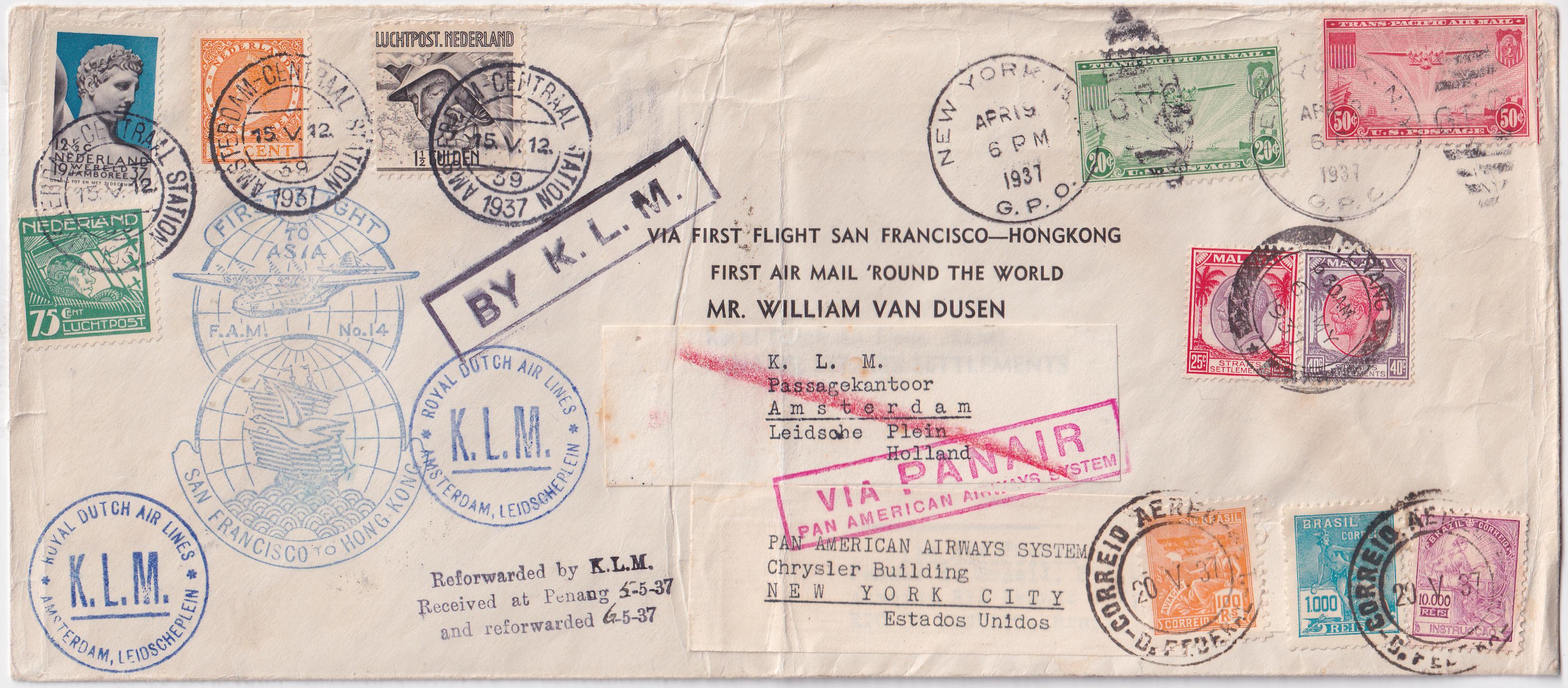 US / Brazil / Netherlands / Malaya 1937 (Apr 19) Pan Am / KLM Around the World Large Cover. 1st flight FAM 14 San Francisco - Hong Kong + more. The cover has some edge flaws. Sold on ebay for $500.