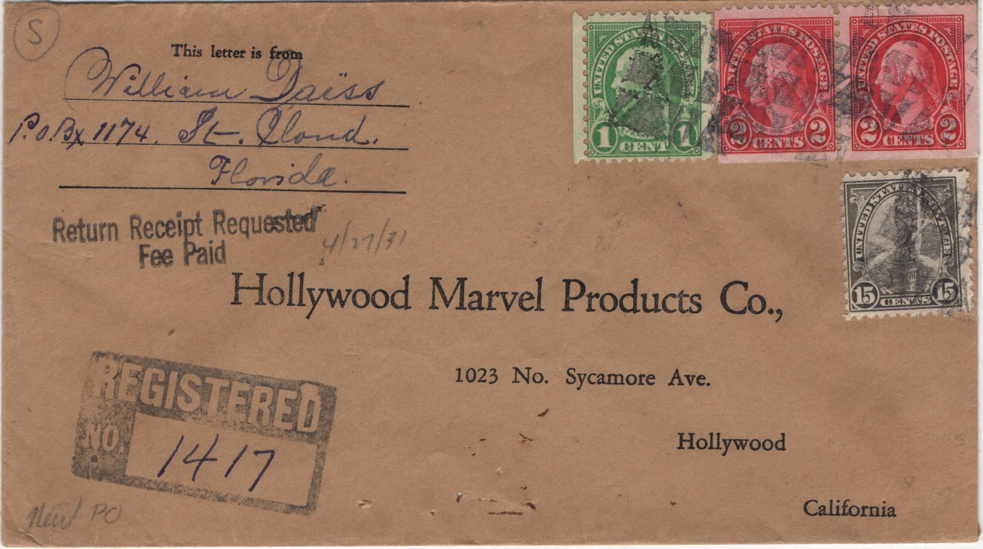 US St Cloud, Fl 1931 (Apr 27) Registered cover with 632, 634 pair, and 696. Each stamp...