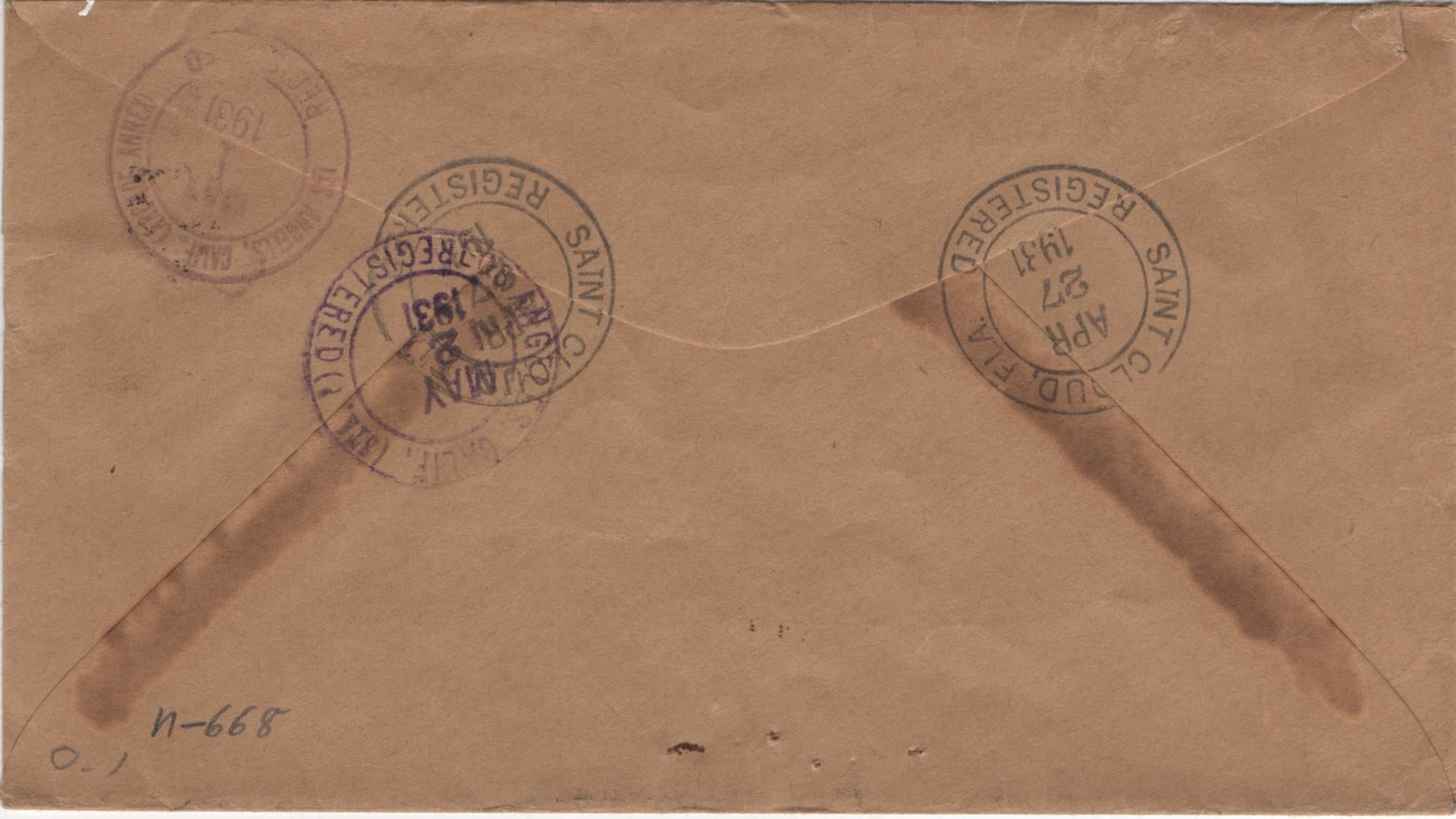 US St Cloud, Fl 1931 (Apr 27) Registered cover with 632, 634 pair, and 696. Each stamp tied by a single strike of N-668 fancy cancel, Geometric Shapes, in black.
