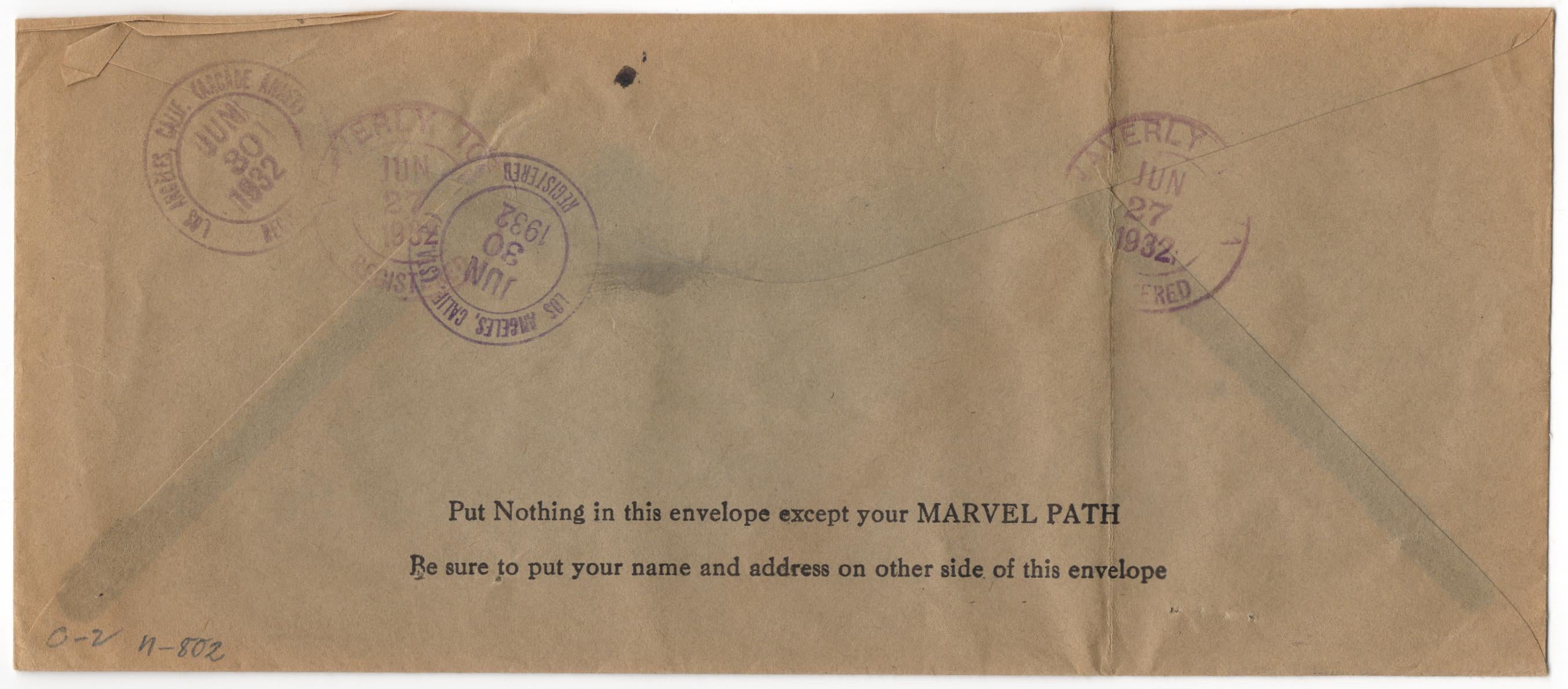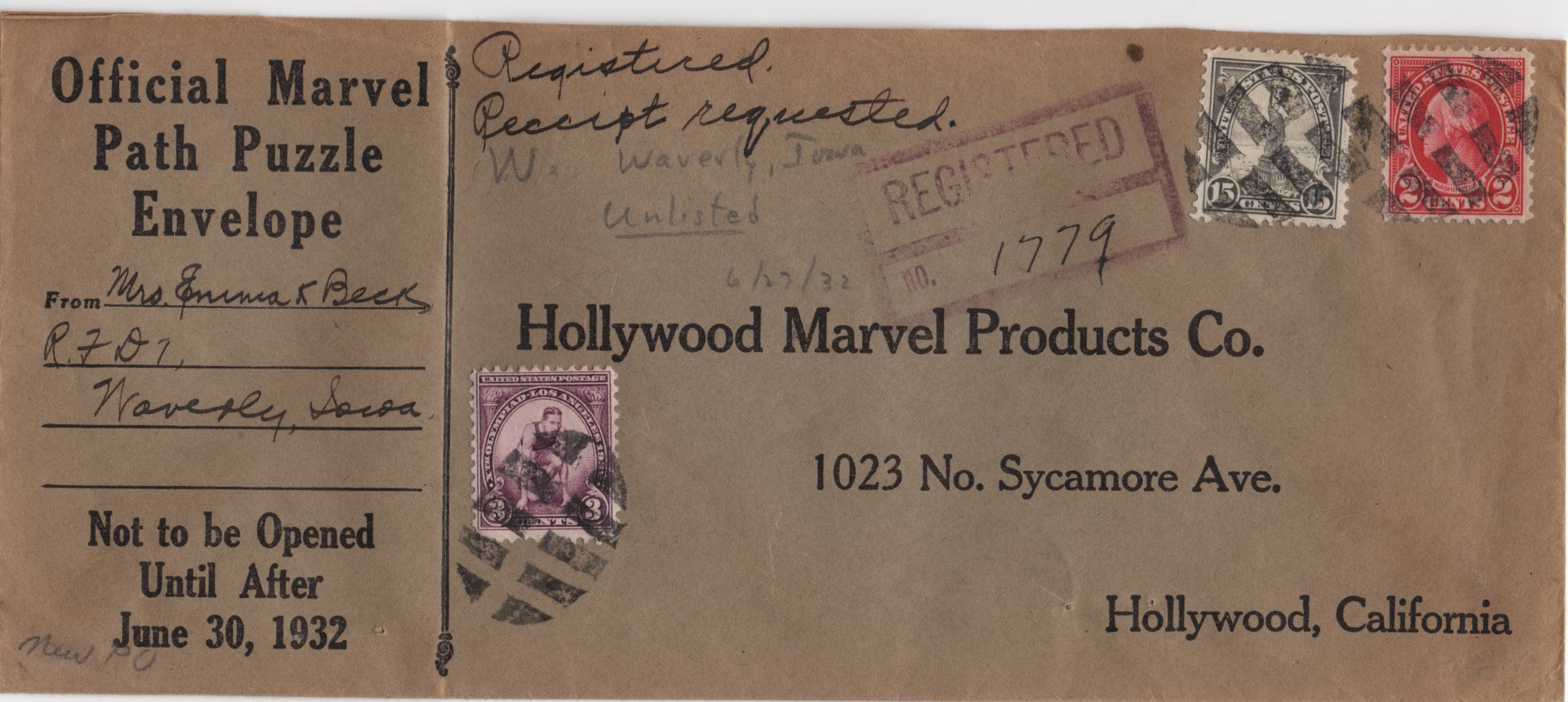 US Waverly, IA 1932 (Jun 27) Legal sized registered cover with 566, 632 and 718. Each stamp tied by a single strike of N-802 fancy cancel, Oval Divided by Geometric Shapes, in black
